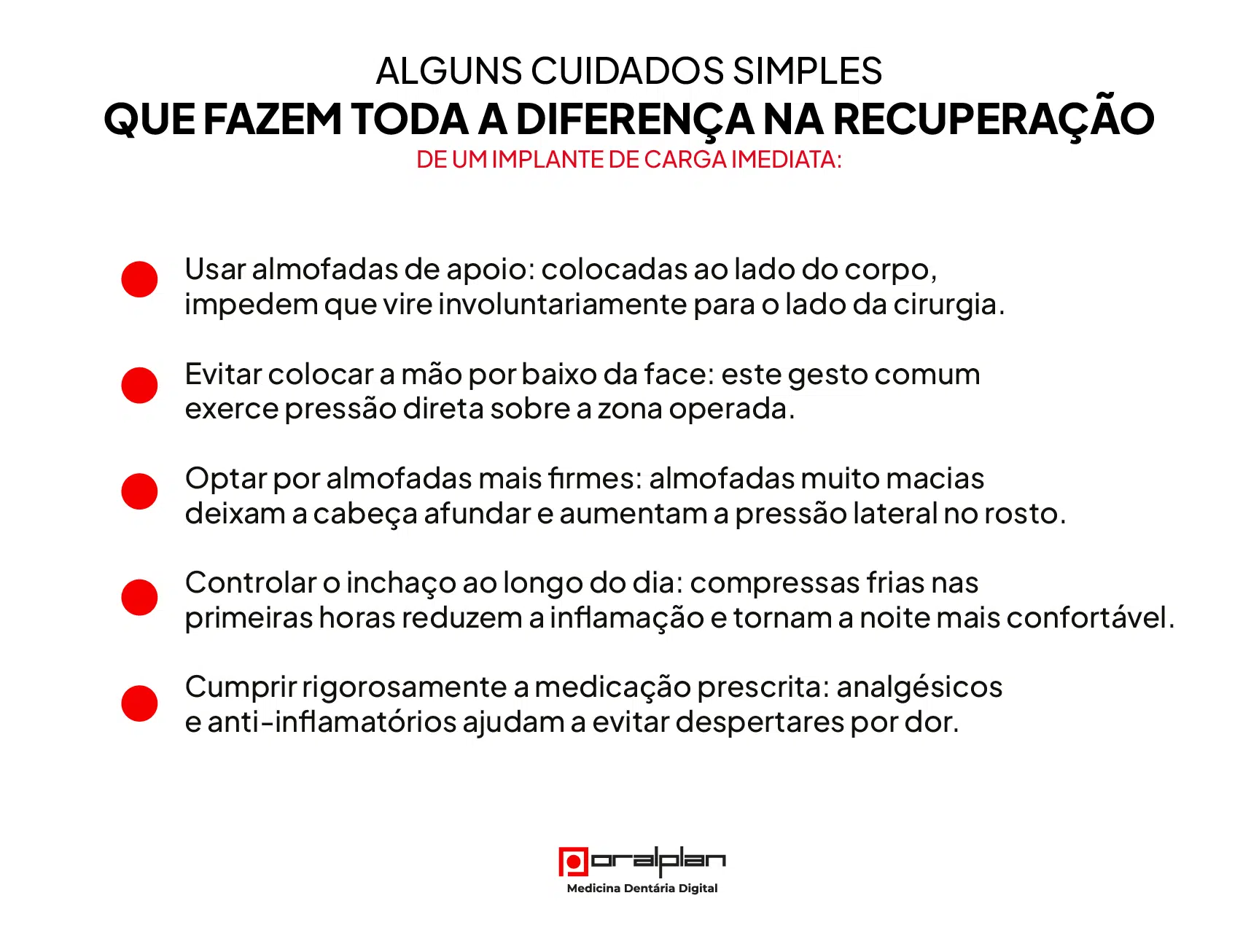 Muitos pacientes têm o hábito de dormir de lado e preocupam-se em mudar esta rotina. Nas primeiras noites de recuperação de um implante de carga imediata, dormir de lado não é recomendado, sobretudo se o lado escolhido for o mesmo da cirurgia.