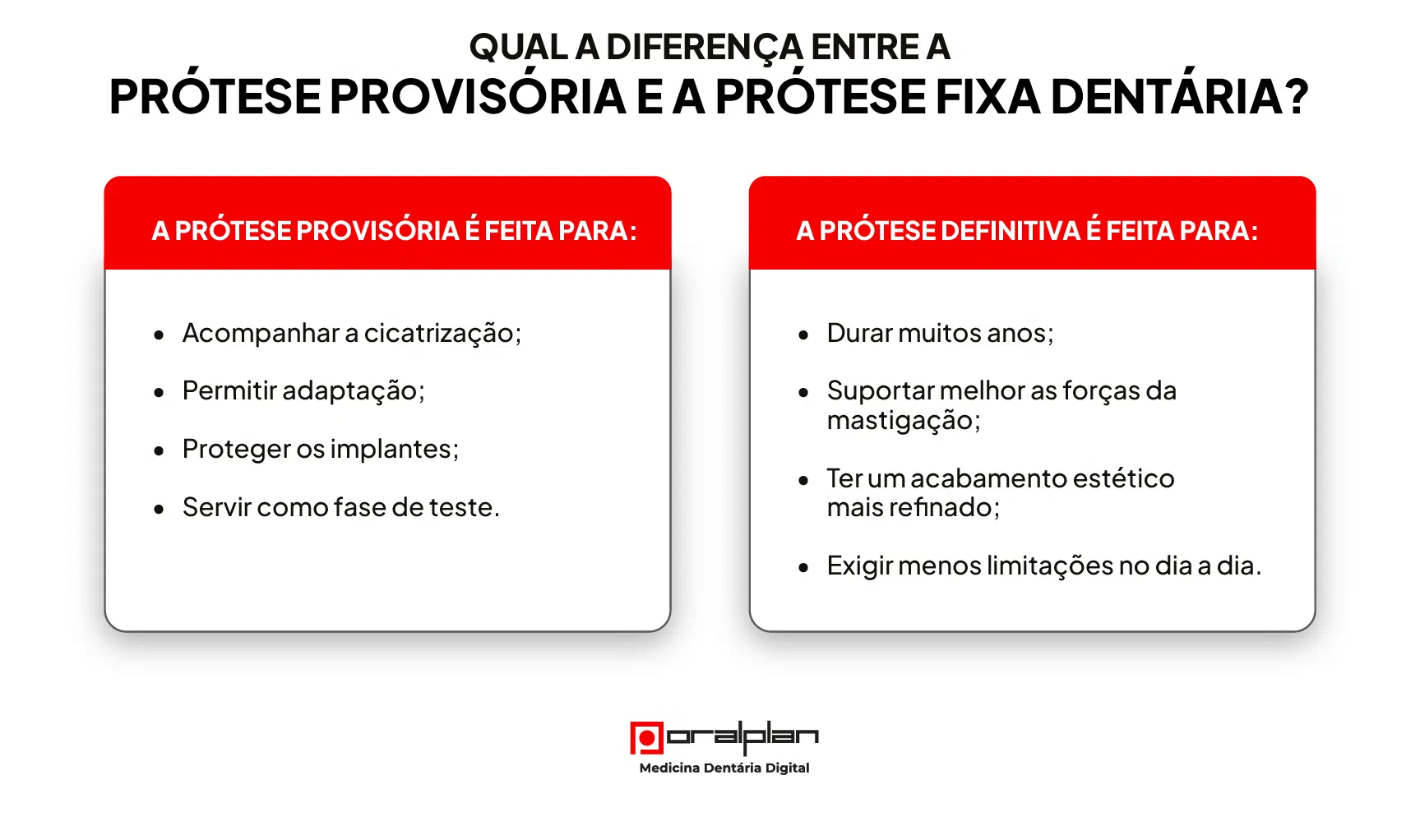 - As diferenças entre a prótese provisória e a definitiva;