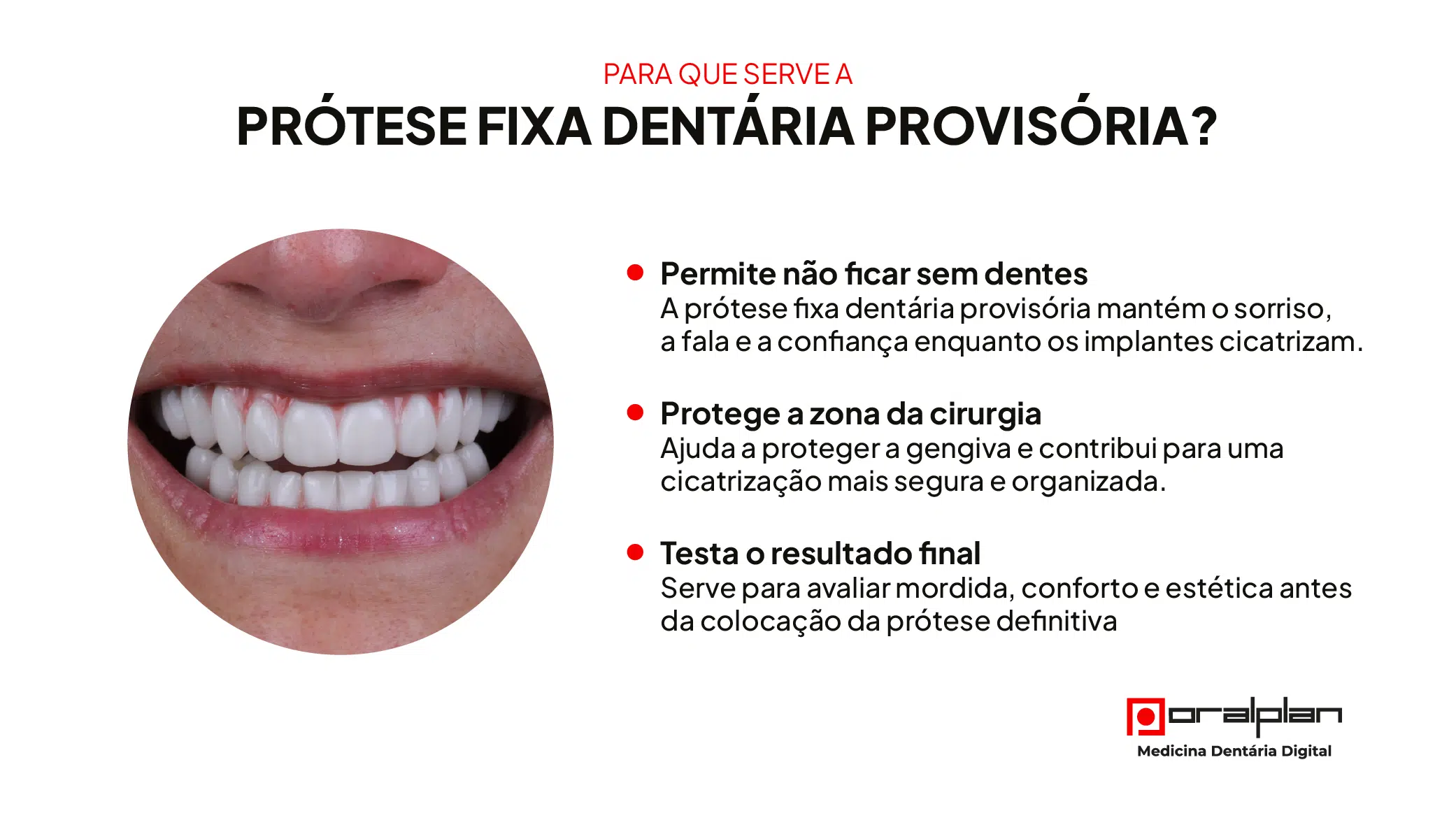 Depois de colocar implantes dentários, a prótese final não é colocada de imediato, existe uma fase intermédia com uma prótese dentária fixa provisória, que permite manter a estética, função e o conforto enquanto o organismo cicatriza e se adapta.