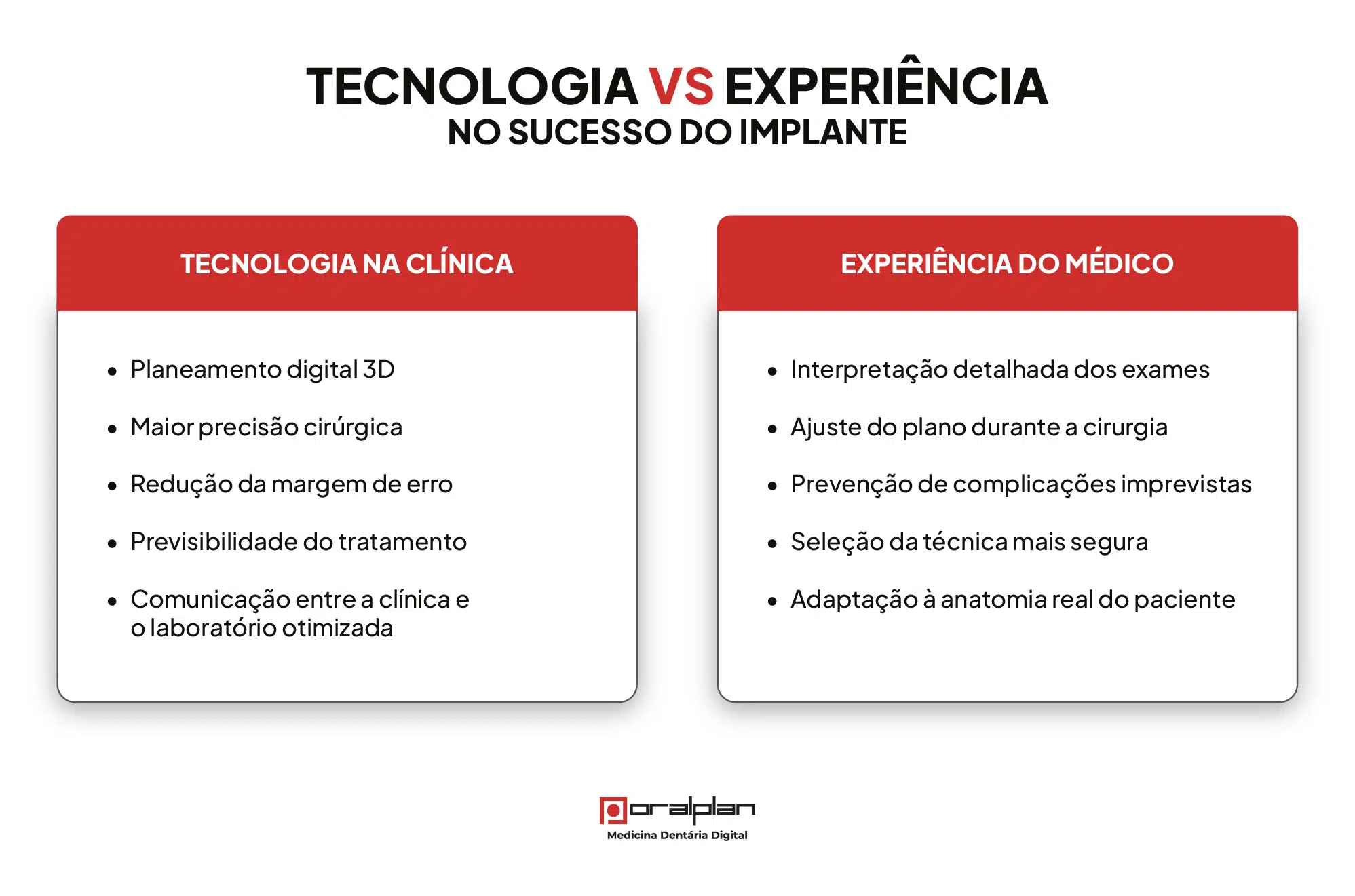 A tecnologia tem um papel fundamental no sucesso dos implantes dentários, oferecendo planeamento digital 3D, maior precisão cirúrgica e uma redução significativa da margem de erro. Permite ainda uma melhor comunicação entre a clínica e o laboratório, tornando o tratamento mais previsível. No entanto, é a experiência do médico que transforma esses recursos em decisões clínicas seguras. Só um profissional experiente consegue interpretar corretamente os exames, ajustar o plano durante a cirurgia, prevenir complicações imprevistas e escolher a técnica mais adequada à anatomia real de cada paciente. Assim, tecnologia e experiência trabalham lado a lado: a primeira oferece ferramentas avançadas; a segunda garante que estas são utilizadas com rigor e discernimento, assegurando resultados consistentes e duradouros.