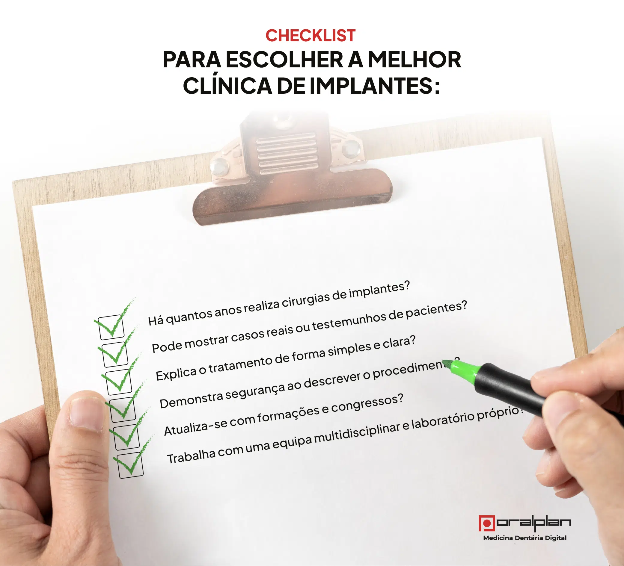 Ao escolher uma clínica de implantes dentários, procure um profissional com experiência comprovada, capaz de explicar o tratamento de forma clara e segura, apresentar casos reais e demonstrar atualização contínua através de formações e congressos. É também importante que trabalhe com uma equipa multidisciplinar e, idealmente, com laboratório próprio, garantindo maior precisão e controlo em todas as etapas do tratamento.