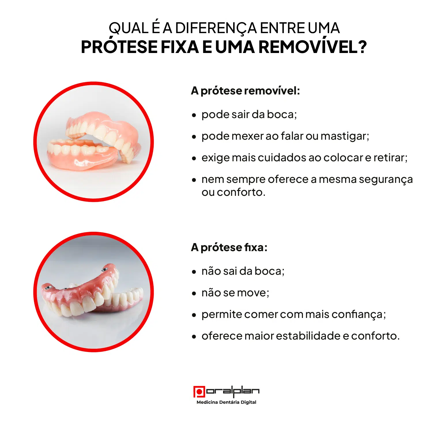 Já a prótese dentária fixa permanece sempre na boca e não necessita de ser removida. Não se move durante a mastigação ou a fala, permite comer com muito mais confiança e oferece uma estabilidade superior. Para muitos pacientes, esta diferença traduz-se numa sensação muito mais próxima de ter dentes naturais, com maior conforto e tranquilidade nas atividades do dia a dia.